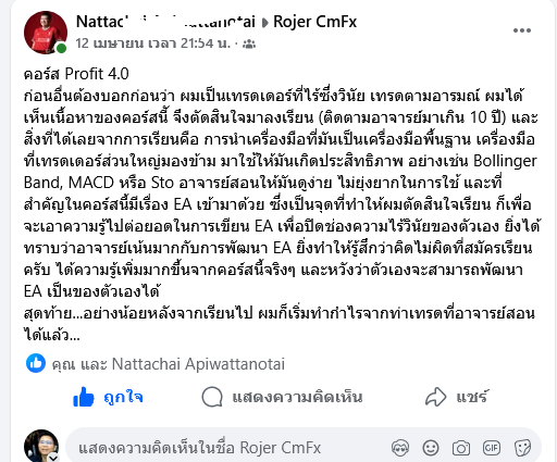 คอร์ส Profit 4.0 เป็นคอร์สที่ให้ความรู้ระดับ Advance จริงๆครับ ได้จุดเข้าที่แม่นยำ การตั้งค่าอินดิเคเตอร์สวยๆ การ MM ที่มีความสำคัญมากๆในการเทรด ที่สำคัญได้เรียนรู้การเขียน EA ที่ถือว่าเป็นสิ่งใหม่สำหรับผม แต่ก็ทำรู้สึกเปิดโลกครั้งใหม่ครับ ขอบคุณ อจ Rojer มากๆครับ