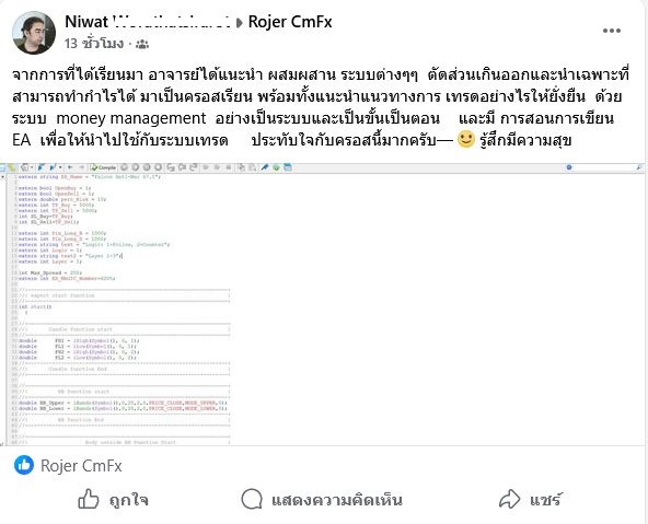 จากการที่ได้เรียนมา อาจารย์ได้แนะนำ ผสมผสาน ระบบต่างๆๆ ตัดส่วนเกินออกและนำเฉพาะที่สามารถทำกำไรได้ มาเป็นครอสเรียน พร้อมทั้งแนะนำแนวทางการ เทรดอย่างไรให้ยั่งยืน ด้วยระบบ money management อย่างเป็นระบบและเป็นขั้นเป็นตอน และมี การสอนการเขียน EA เพื่อให้นำไปใช้กับระบบเทรด ประทับใจกับครอสนี้มากครับ—